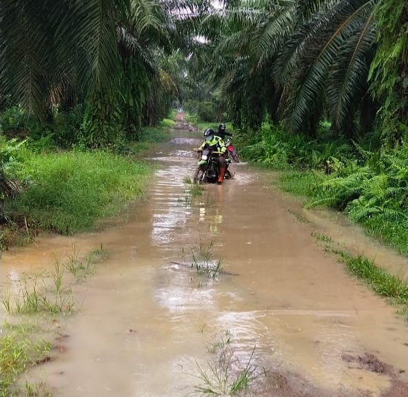 Bahkan pencarian juga dilakukan di areal perkebunan sawit. Dengan menggunakan motor trail, petugas terlihat menerobos jalan perkebunan yang banjir dan berlumpur, meski sejauh ini hasilnya masih nihil.