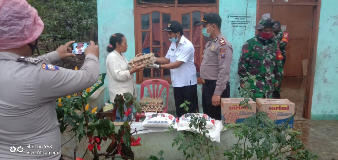Perwakilan Polres Dairi dan jajaran Muspika Sumbul saat menyerahkan bantuan kepada korban bencana puting beliung/foto : can BICARAINDONESIA-Dairi : Bencana angin puting beliung, melanda Dusun Sonsang, Desa Pegagan Julu VII, Kec. Sumbul, Kab. Dairi, Sumatera Utara, Rabu (3/6/2020) sekitar pukul 16.00 WIB.