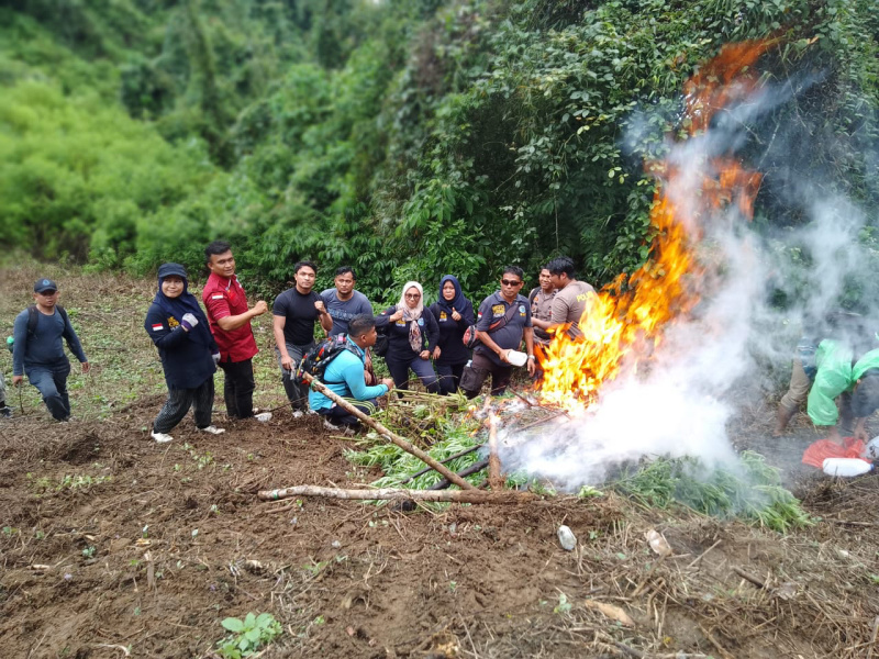 “Total tanaman ganja yang dimusnahkan dengan cara dibakar di lokasi mencapai 10.000 batang. Usia tanaman diperkirakan lima bulan dengan tinggi tanaman ganja berkisar antara 50 hingga 100 cm dengan jarak kerapatan antar tanaman berkisar 50 cm,” kata AKBP Eddy.