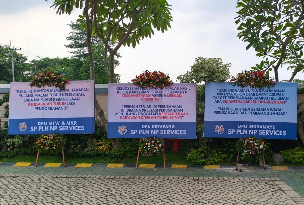 Selain itu, di sejumlah papan bunga dengan pengirim SP PLN NP Services, tertulis pantun berisi protes antara lain “Pergi Ke Kantor Membawa Harapan, Pulang Malam Tubuh Kelelahan, Laba Naik Jadi Kebanggaan, Pendapatan Turun Jadi Pengorbanan”.