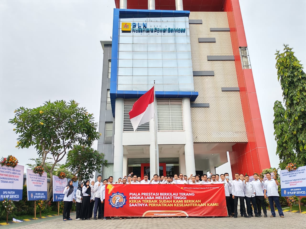 Pantauan di lapangan, tampak pegawai membentangkan spanduk bertuliskan “Piala Prestasi Berkilau Terang, Angka Laba Melesat Tinggi, Kerja Terbaik Sudah Kami Berikan, Saatnya Perhatikan Kesejahteraan Kami!!”.