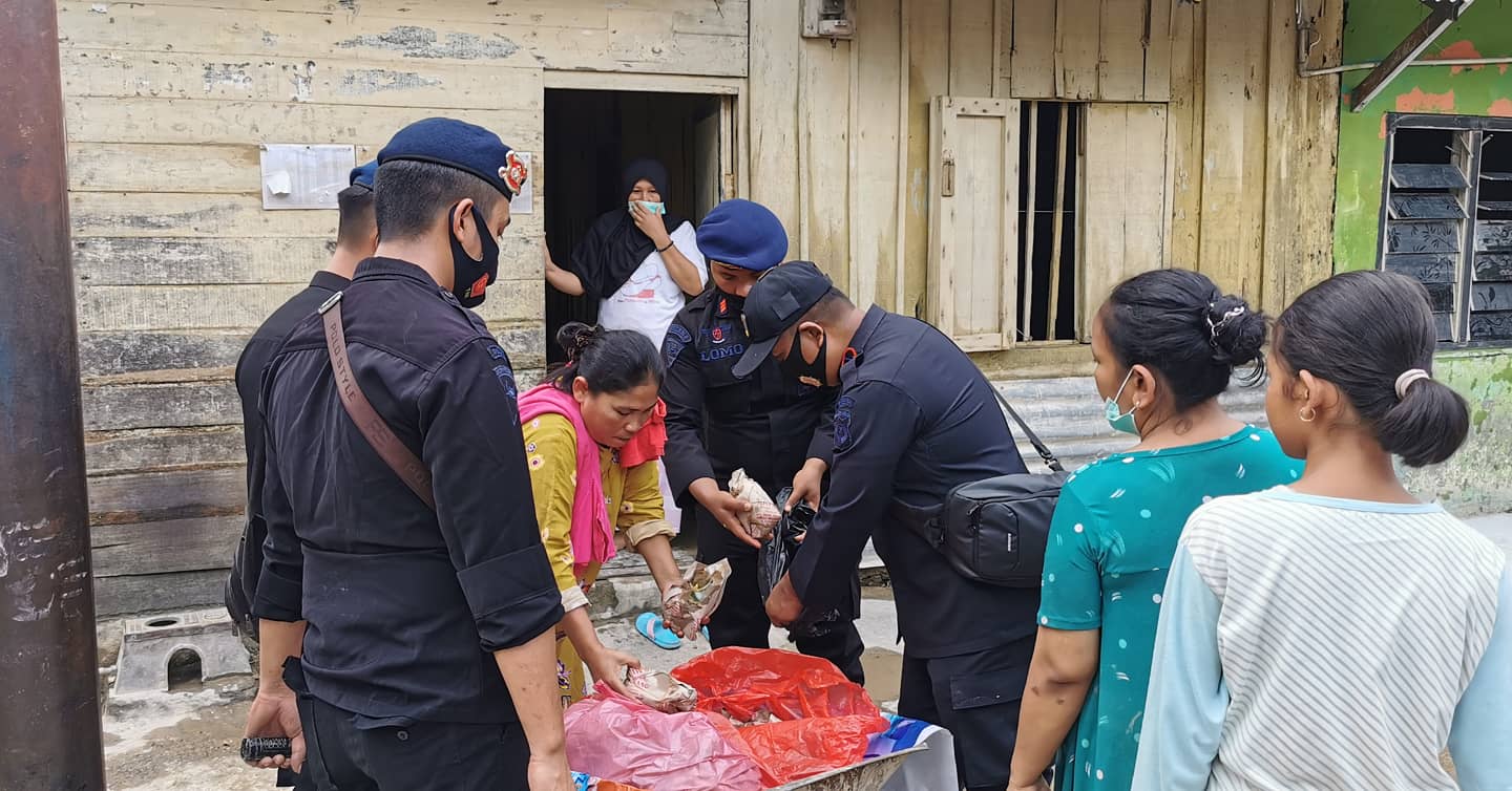 Di bawah pimpinan Kabag Ops Sat Brimob Polda Sumut Kompol Heriyono, personel Brimob membagikan langsung makanan ke rumah warga di Kel. Sei Mati.
