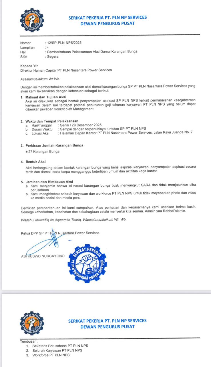 Menurut informasi, aksi yang diinisiasi Serikat Pekerja (SP) perusahaan cucu PT PLN (Persero) ini, terkait hak pegawai berupa bonus tahunan persisnya bonus kinerja tahun 2024, yang dibayar pada November 2025 lalu, dibayar tidak sebagaimana mestinya sesuai dengan pencapaian keuntungan perusahaan.