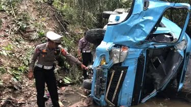 Alhasil, pengemudi membanting setir ke arah kiri hingga akhirnya terjatuh ke dalam jurang sedalam 15 meter.