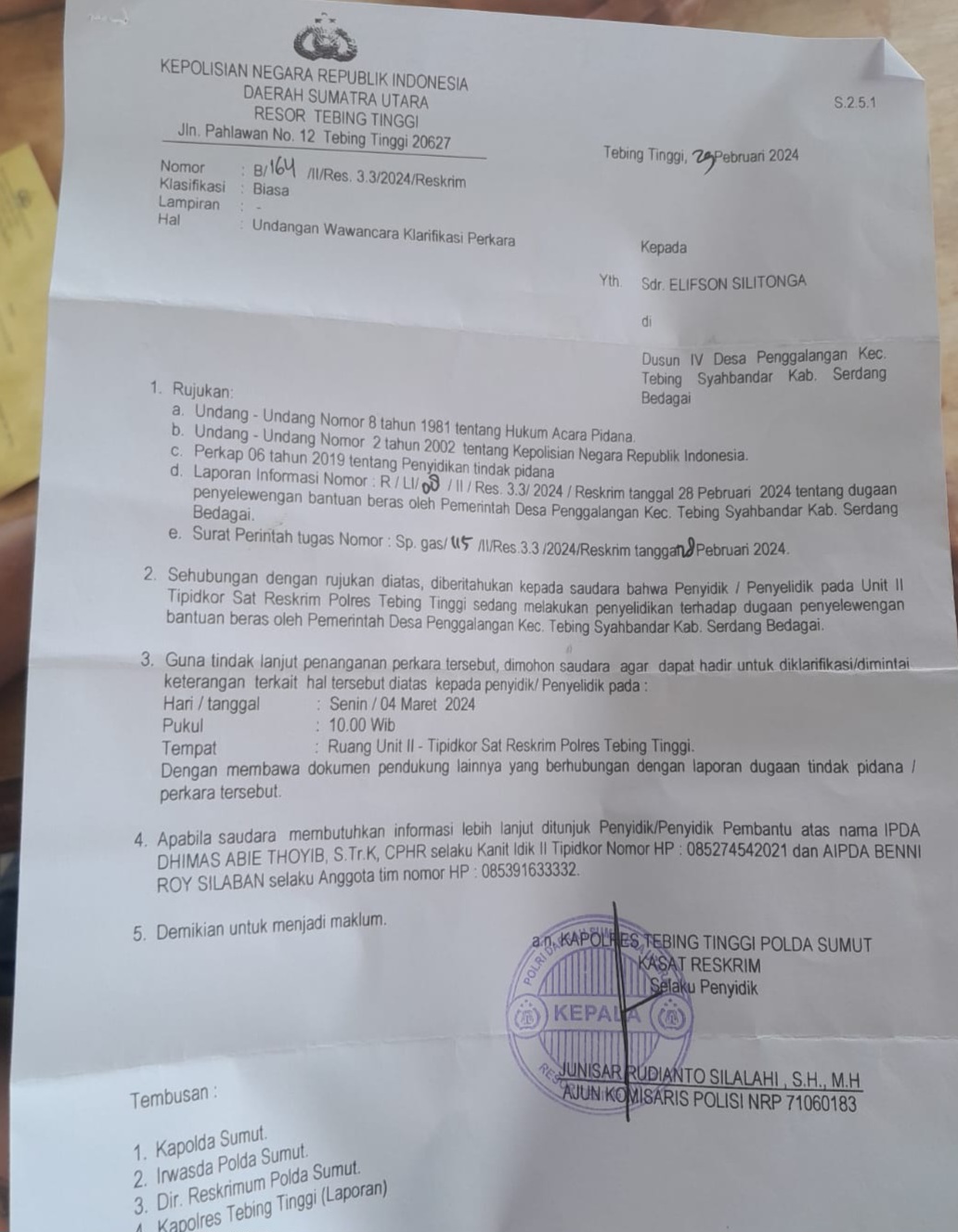 Surat panggilan klarifikasi yang dilayangkan polisi terhadap korban terkait dugaan kasus penyimpangan bansos/foto : ist BICARAINDONESIA-Serdangbedagai : Oknum Kepala Desa (Kades) Penggalangan, Kecamatan Tebing Syahbandar, Kabupaten Serdangbedagai (Sergai), Sumatera Utara, terancam bakal dijebloskan ke bui.