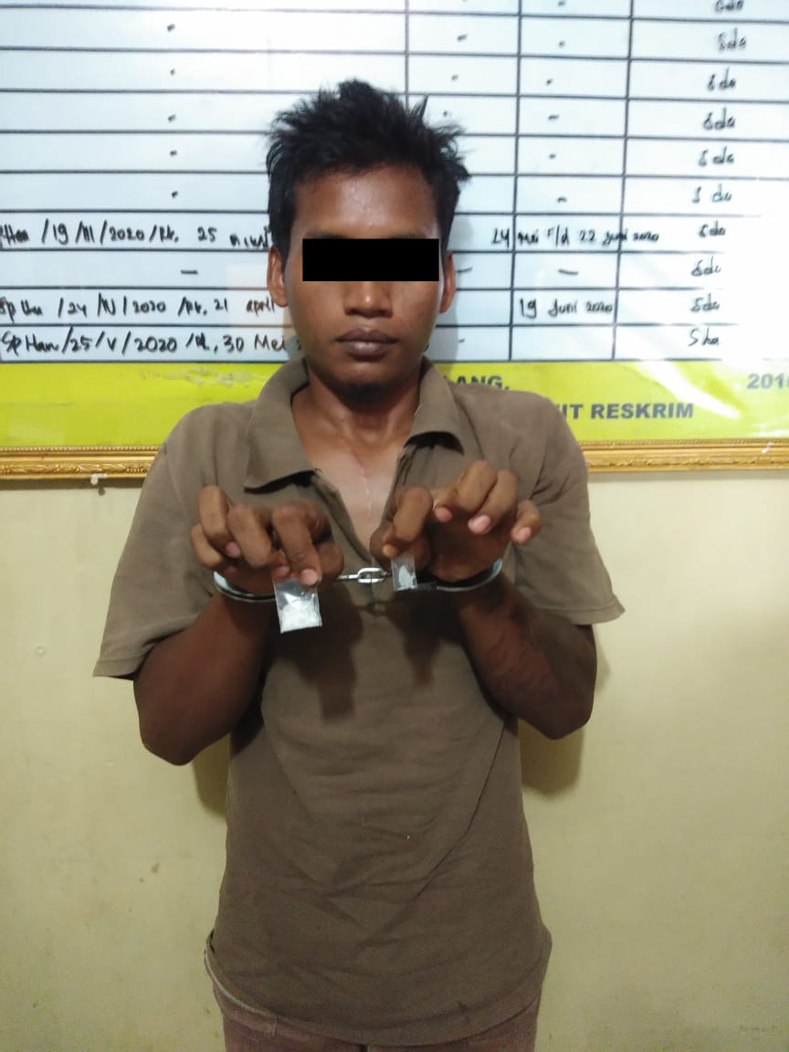 Tersangka L, terlihat pasrah sambil menunjukkan barang bukti sabu yang disita polisi dari tangannya/foto : ist BICARAINDONESIA-Deliserdang : Tekab Polsek Galang menangkap Bandar (BD) narkoba berinisial L, dalam penyergapan dikediamannya Jl. Melati VI, Lingkungan VIII, Kel. Galang Kota, Kec. Galang, Kab. Deliserdang, Sumatera Utara, Selasa, 4 Agustus 2020.