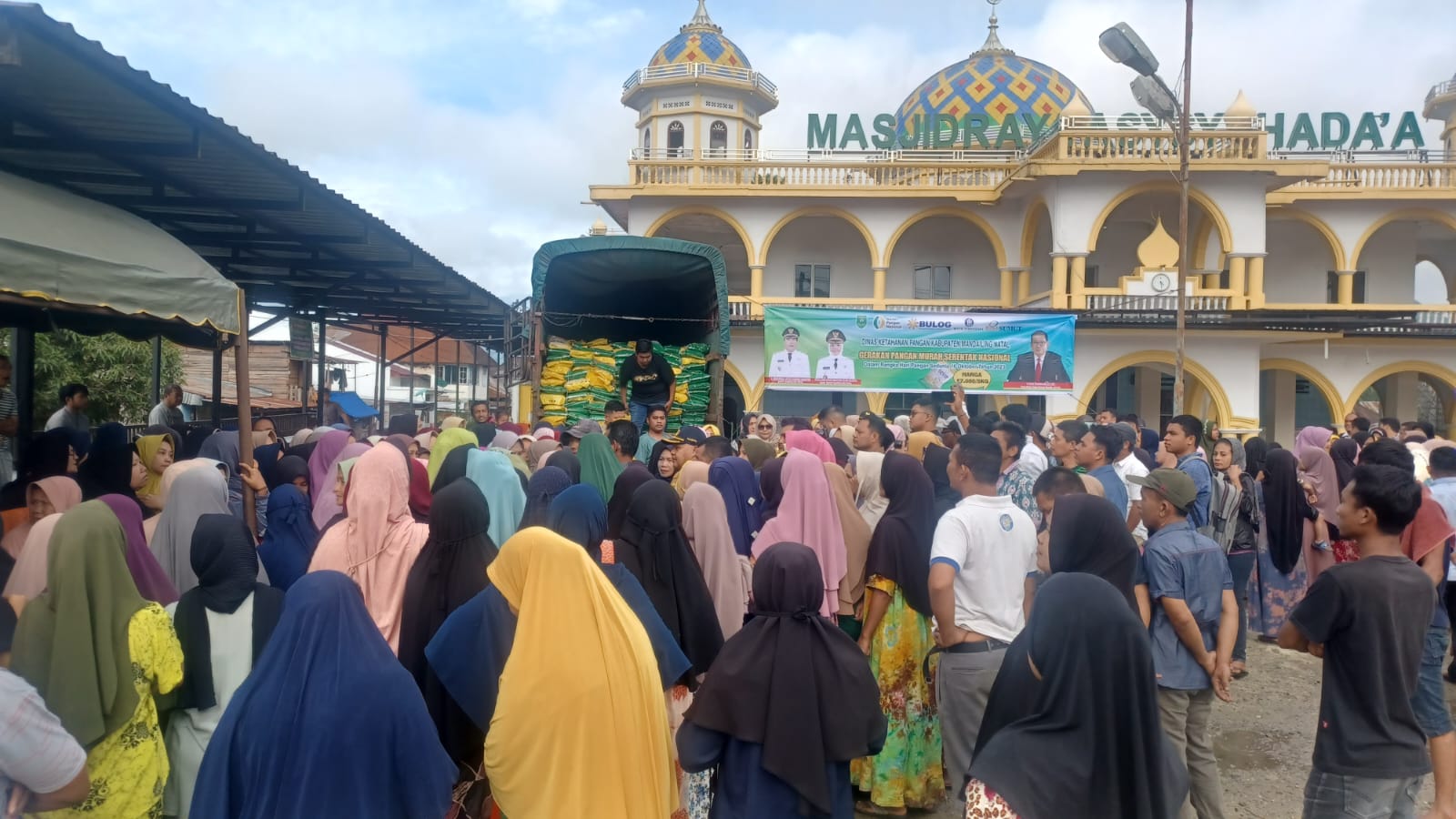 Kegiatan berupa pasar murah pangan yang digelar di pelataran Masjid Raya Assyuhada’a itu pun langsung diserbu warga.