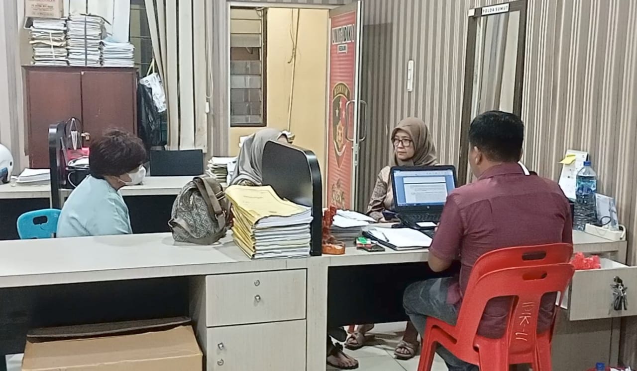 Riza Pauzini Nasution (pakai kacamata) didampingi anaknya Rizky Aryuni Simangunsong tampak memberikan keterangan kepada polisi saat membuat laporan ke Polres Labuhanbatu/foto : ist BICARAINDONESIA-Labuhanbatu : Seorang wanita penduduk Dusun II, Jalan Citarum, Kecamatan Sunggal, Kabupaten Deliserdang, Sumatera Utara bernama Riza Pauzini Nasution, melaporkan tiga akun facebook ke Polres Labuhanbatu dalam kasus dugaan penyebaran content video yang berisikan kebohongan (hoax), Kamis Sore (24/8/2023).