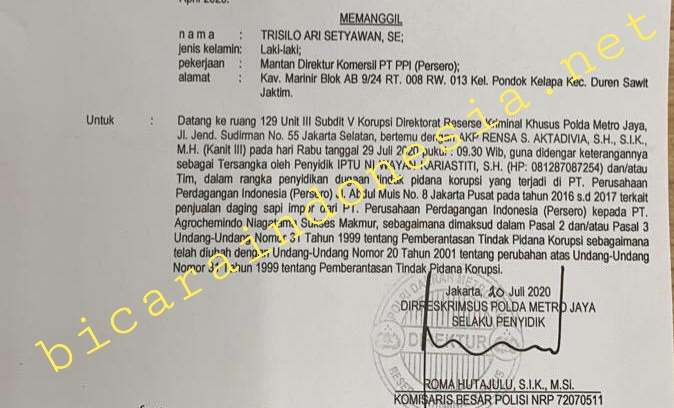 Bukti sprint.sidik dan pemanggilan terhadap TSA, Dirut PT KIM (Persero) yang menjadi tersangka kasus dugaan korupsi sebesar Rp33 miliar dalam proyek penjualan daging impor dijabatan dia sebelumnya/foto : ist BICARAINDONESIA-Medan : Terkait kasus dugaan korupsi penjualan daging impor, Direktur Utama PT Kawasan Industri Medan (Persero) berinisial TAS, akhirnya memenuhi panggilan Penyidik Subdit V Korupsi Direktorat Reserse Kriminal Khusus (Ditreskrimsus) Polda Metro Jaya (PMJ) dalam kapasitasnya sebagai tersangka.