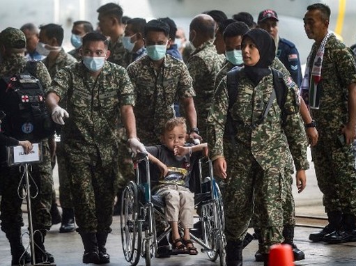 Nordin mengatakan korban luka dipilih setelah ‘evaluasi cermat’ untuk memastikan mereka layak untuk penerbangan selama 19 jam yang singgah di Karachi, Pakistan. Para korban luka ditemani oleh 86 anggota keluarga atau kerabat terdekat.