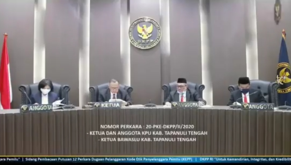 Sidang DKPP, Ketua DKPP RI Prof. Dr. Muhammad, S.IP, M.Si didampingi, Dr. Ida Budhiati, SH., MH, Prof. Dr. Teguh Prasetyo, SH., M.Si, Dr. H. Alfitra Salam, APU, Hasyim Asy’ari, SH., M.Si., Ph.D, Didik Supriyanto, S.IP, MIP, dan M. Afifuddin, S.Th.I., M.Si masing masing anggota DKPP RI saat membacakan pemberian sanksi berat dan pemberhentian Ketua dan anggota KPU dan Ketua Bawaslu Tapteng/foto : ist BICARAINDONESIA-Tapanuli Tengah : Dewan Kehormatan Penyelenggara Pemilu (DKPP) secara resmi telah memberikan teguran keras kepada Ketua Bawaslu Tapteng dan kelima Komisioner Komisi Pemilihan Umum (KPU) Kabupaten Tapanuli Tengah, Sumatera Utara.