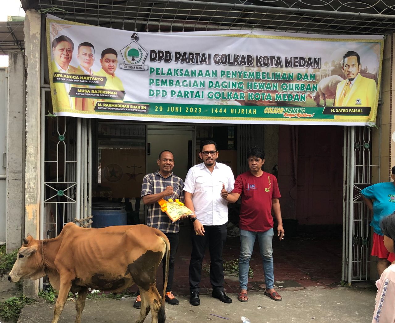 Bacaleg Partai Golkar Kota Medan H Sayed Faisal, SH, MH saat menyerahkan sapi kurban kepada masyarakat Kota Matsum, Medan Area/foto : ist BICARAINDONESIA-Medan : Hari raya Idul Adha 1444 H, menjadi momen bagi sejumlah orang untuk berbagi, khususnya berbagi daging kurban. Seperti yang dilakukan DPD Golkar Kota Medan.