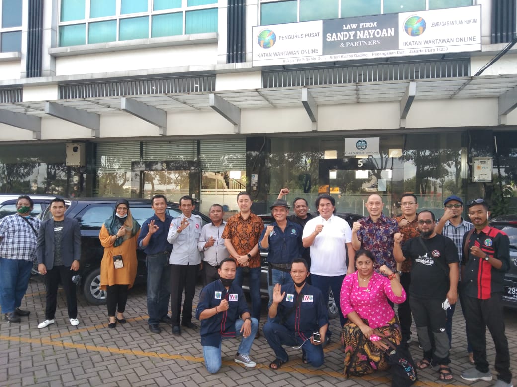 Prosesi potong tumpeng yang dilakuka Ketua Umum IWO Jodhi Yudono dan Direktur Sandy Nayoan menandai syukuran berdirinya LBH IWO/foto : ist BICARAINDONESIA-Jakarta : Meski di tengah pandemi, syukuran peresmian Lembaga Bantuan Hukum (LBH) Ikatan Wartawan Online (IWO) yang digelar secara sederhana kawasan perkantoran Fifty 5 Jl. Arteri Kelapa Gading Jakarta pada Minggu, 21 Februari 2021 kemarin, terasa sangat bermakna.