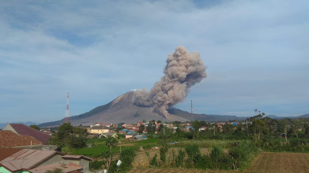 Erupsi gunung api Sinabung yang lontarkan kolom abu setinggi 1.500.meter dan luncuran awan panas sejauh 2.000 meter/foto : ist BICARAINDONESIA-Karo : Geliat Gunung Api Sinabung di Kab. Karo, Sumatera Utara kembali menunjukkan peningkatan dalam beberapa hari terakhir yang ditandai dengan kembali terjadinya erupsi.