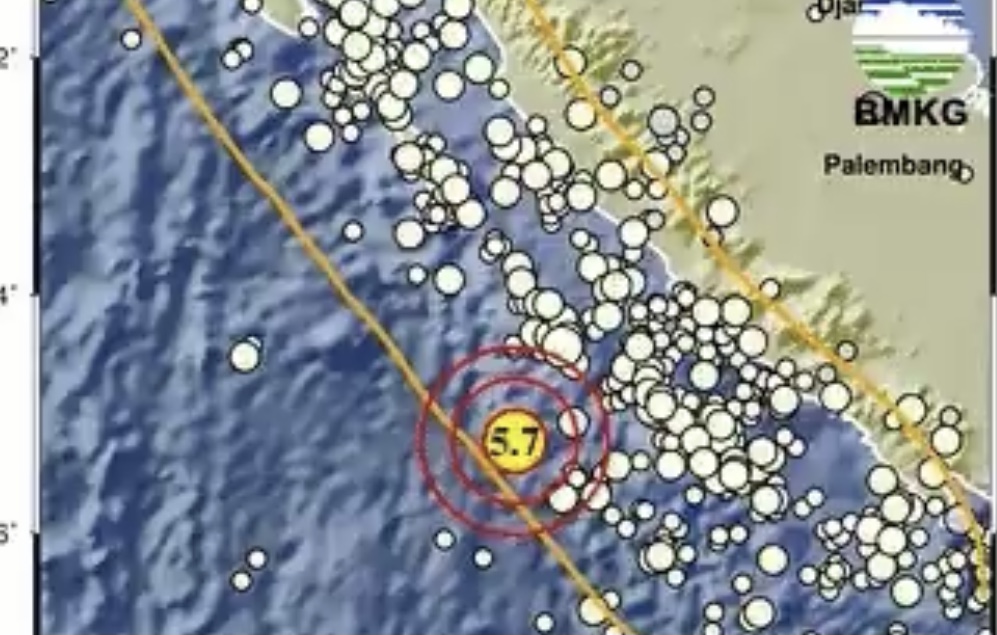 Screenshot BICARAINDONESIA-Jakarta : Gempa bumi dengan kekuatan magnitudo (M) 5,7 terjadi di Enggano, Bengkulu. Pusat gempa berada di laut.
