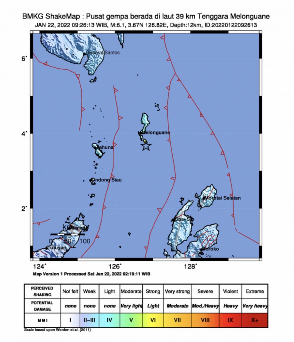 “#Gempa Magnitudo: 6.1, Kedalaman: 12 km, 22 Jan 2022 09:26:13 WIB, Koordinat: 3.67 LU-126.82 BT (39 km Tenggara MELONGUANE-SULUT), Tidak berpotensi tsunami #BMKG,” tulis BMKG dalam twitter-nya @infoBMKG.