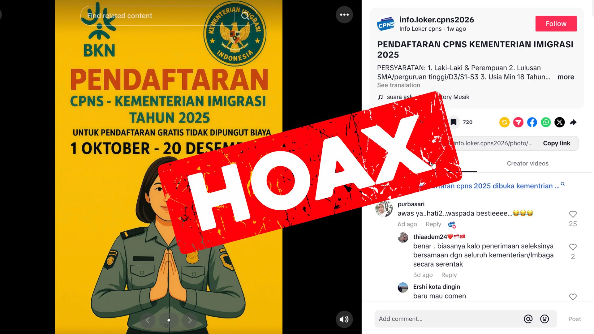 Menurutnya, berdasarkan hasil penelusuran pihaknya, informasi yang tak bisa dipertanggungjawabkan itu pertama kali diposting di kanal media sosial TikTok dengan nama @info.loker.cpns2026 (https://www.tiktok.com/@info.loker.cpns2026/photo/7559444804065660216) aktif mengunggah pengumuman tentang “Pendaftaran CPNS Kementerian Imigrasi Tahun 2025” yang dimulai pada 1 Oktober hingga 20 Desember 2025″.