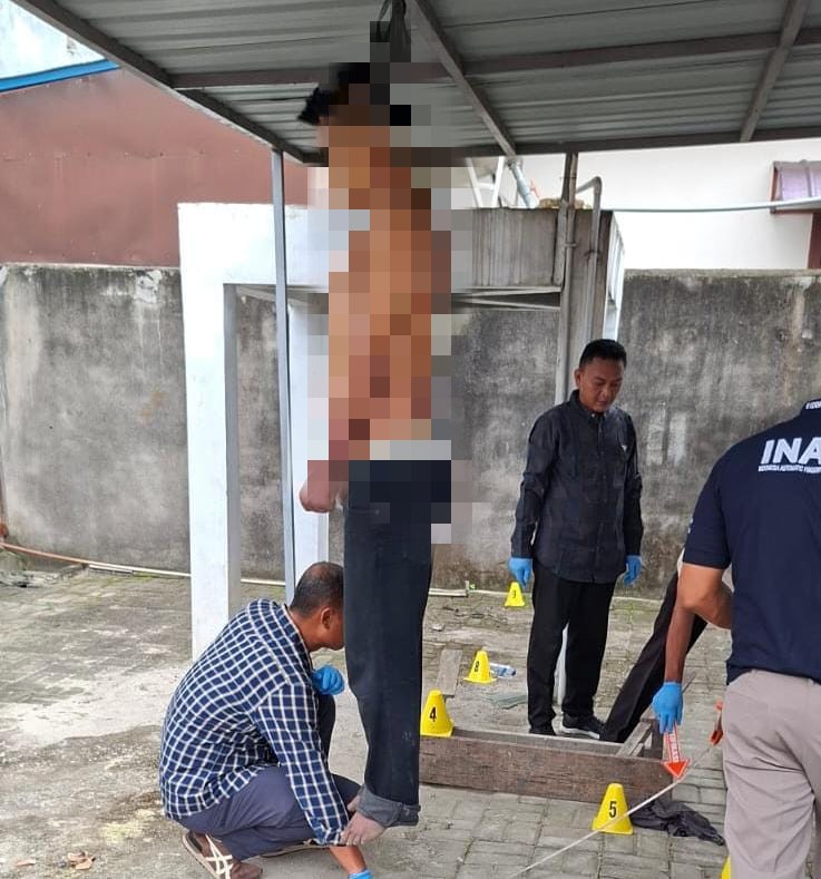Di antara tubuh korban yang masih tergantung, tampak Tim Inafis Polresta Deliserdang melakukan olah TKP/foto: ist BICARAINDONESIA-Deliserdang: Aksi gantung diri kembali berulang di Kecamatan Lubukpakam, Kabupaten Deliserdang, Sumatera Utara. Bahkan kini seolah menjadi trend, sebelum menghabisi nyawanya, korban sengaja meninggalkan wasiat secarik kertas berisi pesan terakhir.