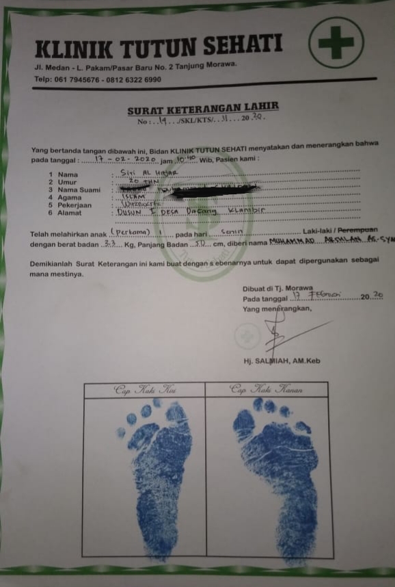 Surat kelahiran anak buah cinta buah cinta TMS dengan Siti Al Hajar Nasution yang dikeluarkan klinik pada 17 Februari 2020/foto : ist