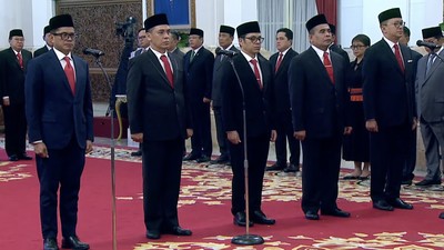 Menteri dan wakil menteri baru mengucapkan sumpah jabatan di hadapan Presiden RI Jokowi di Istana pada pagi ini bersama sejumlah pejabat negara baru.