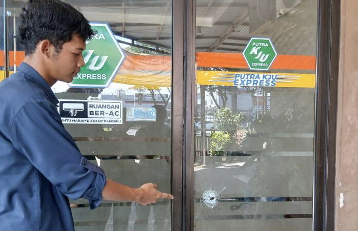 Tembakan pria itu mengenai kaca pintu kantor. Selanjutnya para pelaku langsung melarikan diri.