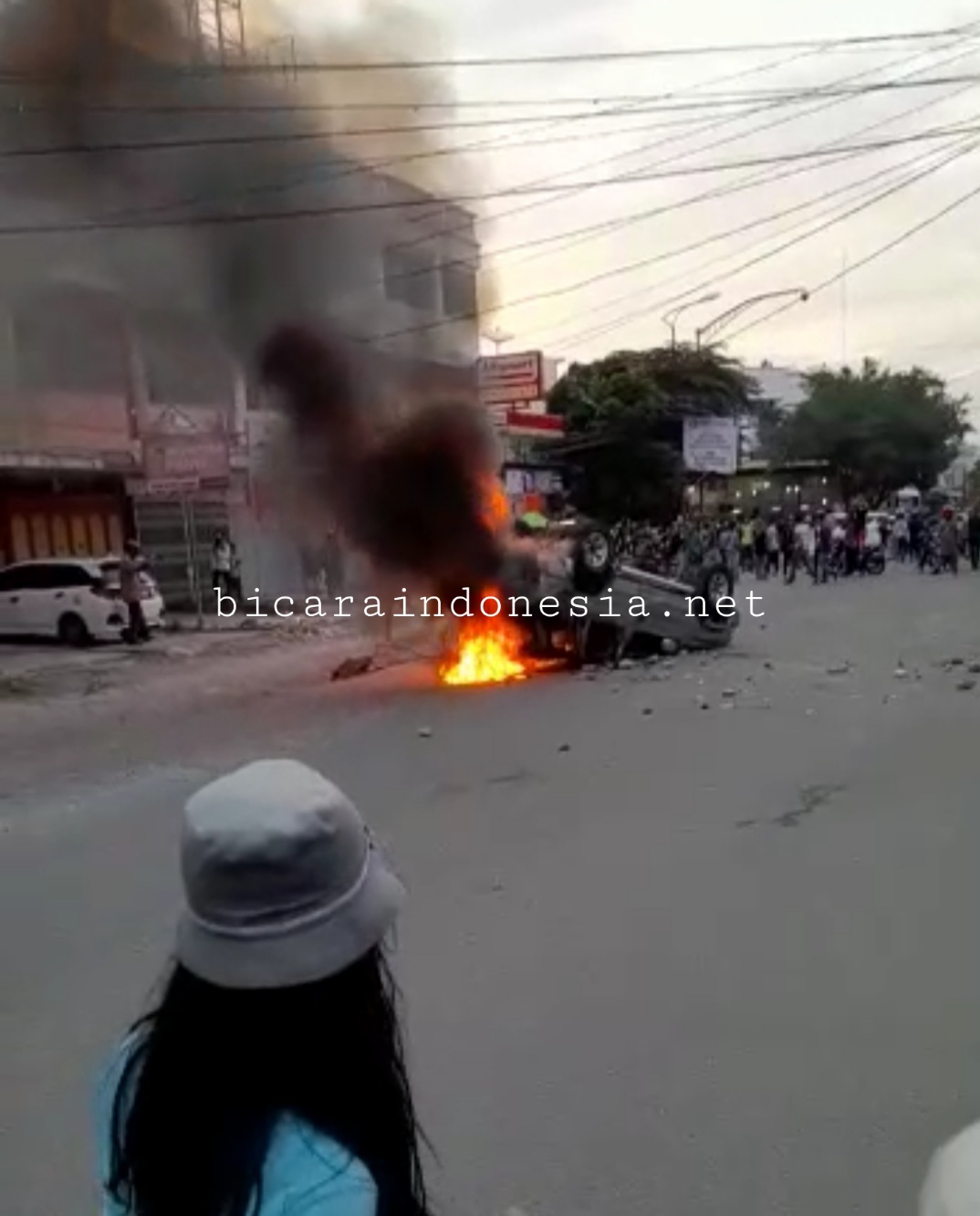 Kobaran api dari mobil dinas kepolisian yang dibakar massa di Jl. Sekip Medan/foto : ded BICARAINDONESIA-Medan : Hingga jelang petang, kerusuhan yang melanda Kota Medan sebagai dampak dari unjukrasa menolak Undang-Undang Cipta Kerja, Kamis (8/10/2020), terus meluas.