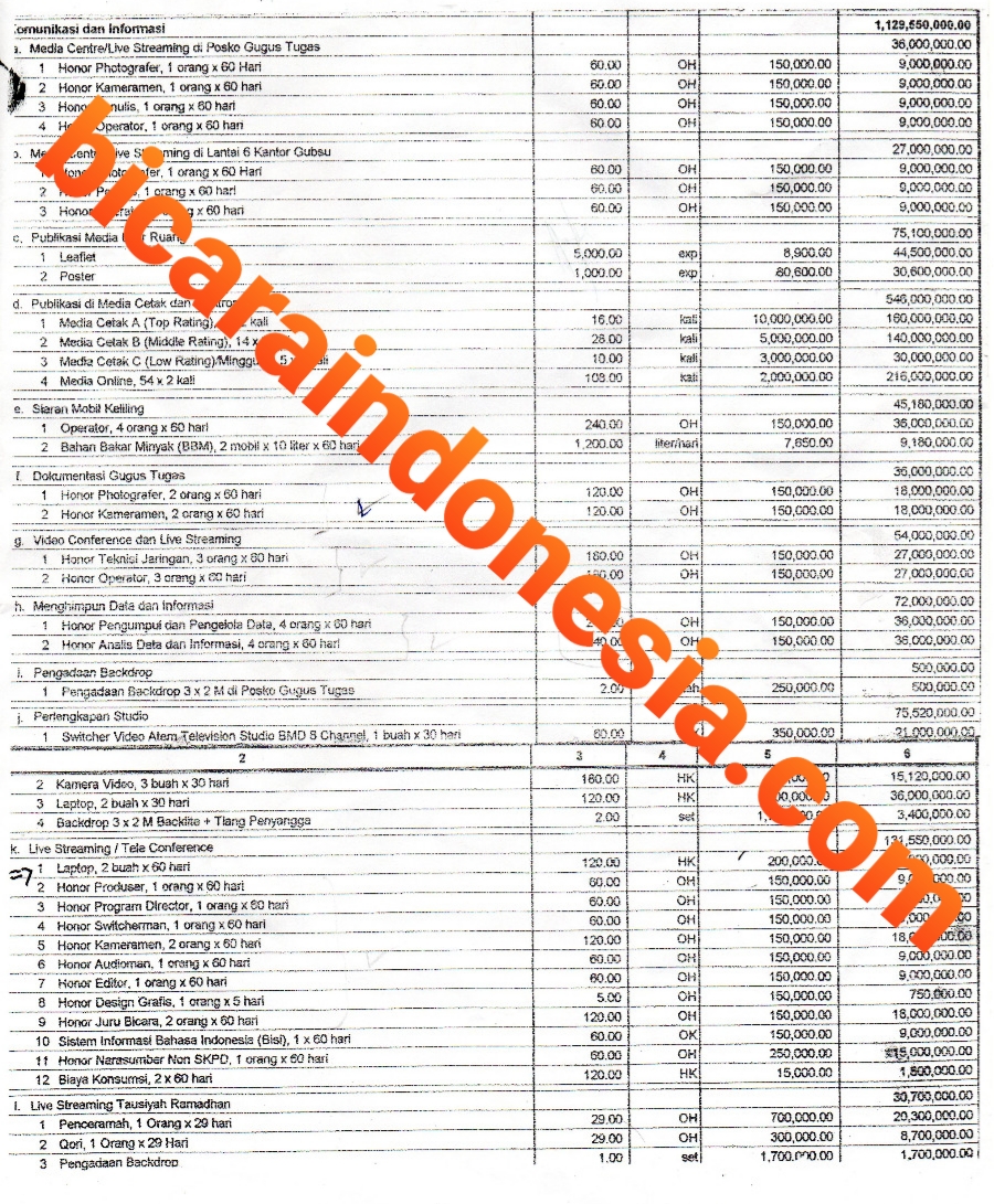Dari data yang diterima Bicaraindonesia.net, dana sebesar Rp517.800 meliputi dana untuk Pengelolaan Jaringan, Website, Medsos Covid-19 dan Video Conference, terdapat dana untuk honor pengelola jaringan Rp9.000.000 honor pengelola server Rp9.000.000, honor pengelola pengembangan aplikasi Rp18.000.000, honor pengelola video conference Rp18.000.000 , honor pengelola website dan media sosial Rp18.000.000 serta honor narasumber non SKPD Rp14.400.000.