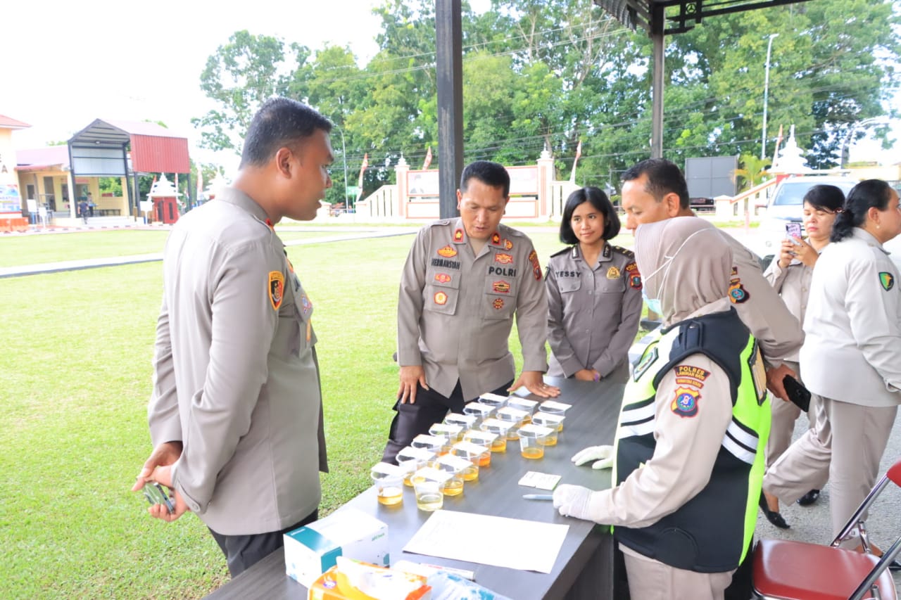 Kapolres Labuhanbatu AKBP James H. Hutajulu saat memantau tes urine Seluruh personel Sipropam/foto : ist