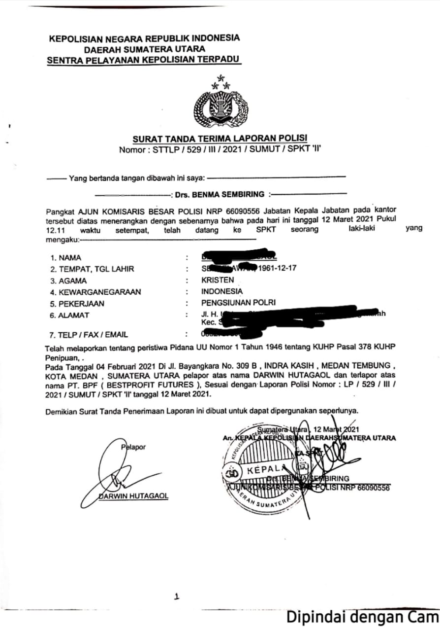 Merasa tidak mendapatjawaban dan kepastian menyangkut dana yang telah diinvestasikan dari PT.BPF, DH akhirnya membuat laporan ke Polda Sumatera Utara pada Maret 2021 lalu