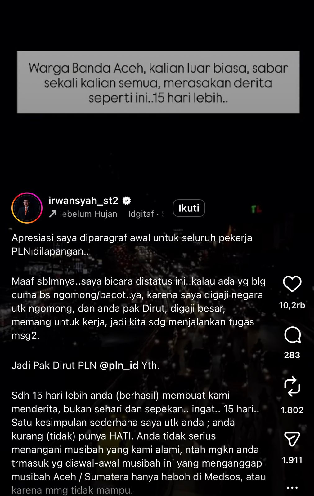 Postingan Ketua DPRK Banda Aceh Irwansyah, ST di akun instagramnya/foto: ist BICARAINDONESIA-Aceh: Sorotan negatif terhadap PT PLN (Persero) terus menggema. Terlebih terkait lambatnya penanganan pemulihan sistem kelistrikan di Aceh pasca bencana banjir.
