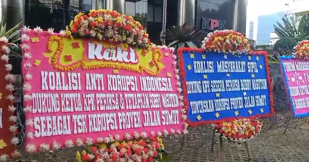 Isi narasidi karangan bunga itu seragam semua. mendukung KPK segera memeriksa dan menetapkan Gubernur Sumatera Utara Bobby Nasution dalam perkara dugaan tindak pidana korupsi Jalan di Sumut.