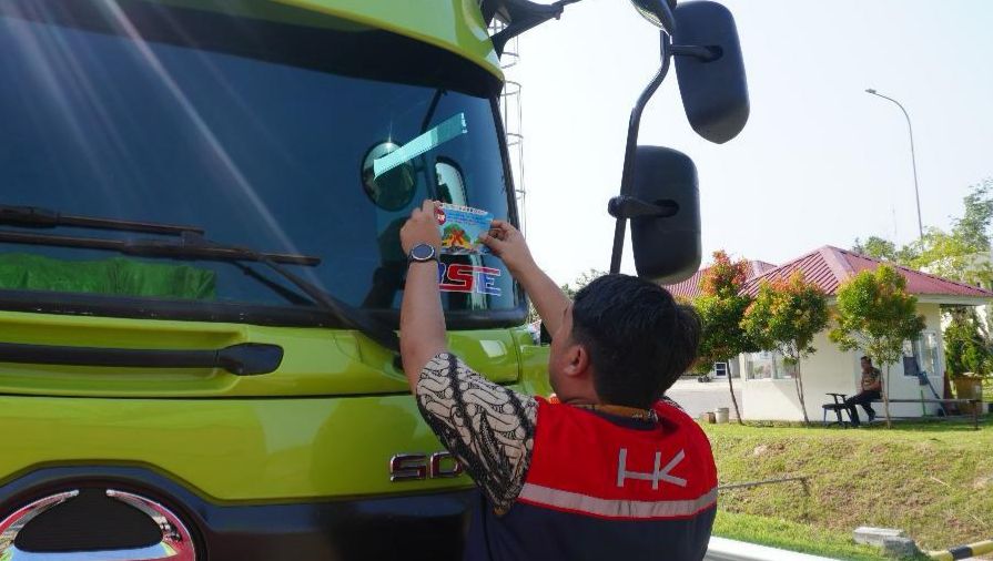Tim HK melakukan pemasangan stiker sebagai bentuk sosialisasi keselamatan berkendara/foto: ist BICARAINDONESIA-Jakarta: PT Hutama Karya (Persero) (Hutama Karya) terus menunjukkan komitmennya dalam menjaga keselamatan pengguna jalan tol melalui penerapan kebijakan kendaraan dengan muatan dan dimensi berlebih atau Over Dimension and Over Loading (ODOL).