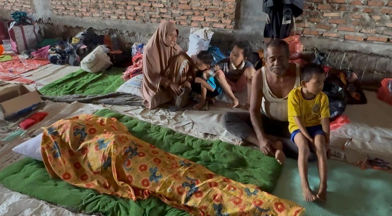 Muhammad Hasan tampak mendampingi jenazah sang istri Aisyah yang disemayamkan di lokasi pengungsian mereka di Aceh Tamiang/foto: dis BICARAINDONESIA-Aceh Tamiang: Duka kembali menyelimuti bencana di Kabupaten Aceh Tamiang, setelah satu lagi korban banjir, meninggal dunia di sebuah ruko belum selesai dibangun yang mereka jadikan sebagai lokasi pengungsian.