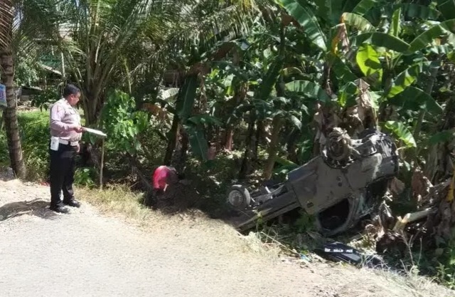 “Mobil itu melaju dengan kecepatan tinggi saat ban belakang sebelah kempis, sehingga lepas kendali dan oleng ke kanan-kiri. Kemudian terbalik di kebun warga,” ujarnya.