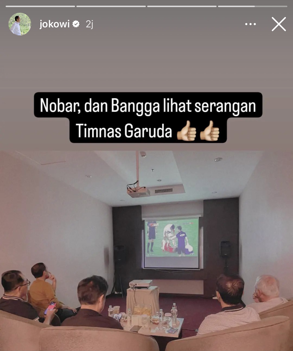 “Nobar, dan bangga lihat serangan timnas Garuda,” ujar Jokowi.