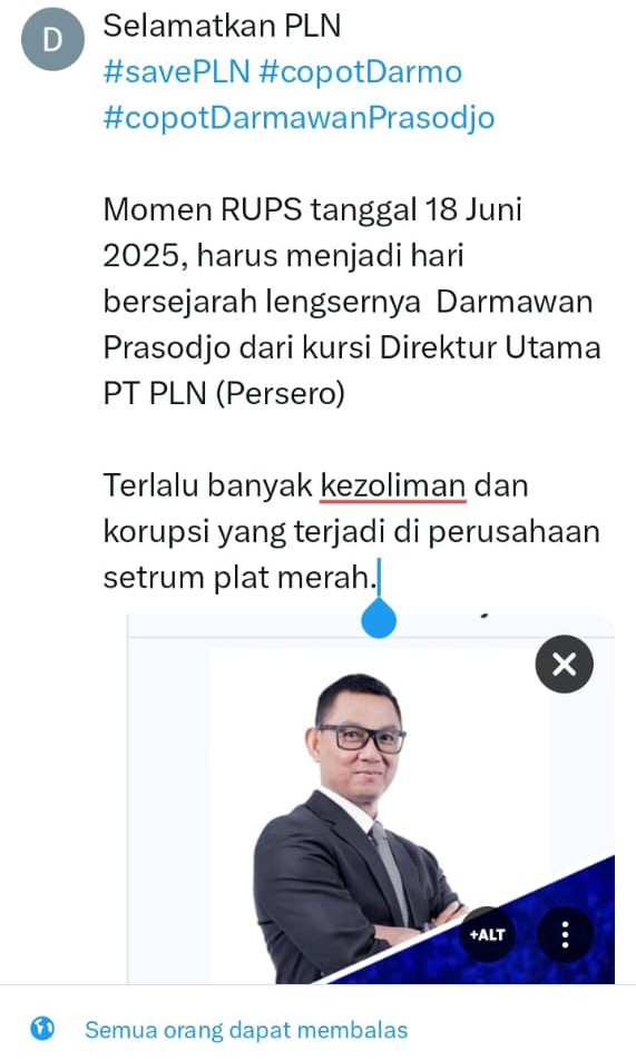 Dalam postingan yang diunggah akun Darwasi Prasojo @DarwasiP89500 turut dipaparkan kalimat “Momen RUPS tanggal 18 Juni 2025, harus menjadi hari bersejarah lengsernya Darmawan Prasodjo dari kursi Direktur Utama PT PLN (Persero). Terlalu banyak kezoliman dan korupsi yang terjadi di perusahaan setrum plat merah”.
