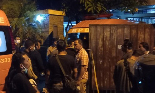 Polisi dan petugas medis sedang memeriksa kondisi jenazah korban di lokasi kejadian. Terlihat juga beberapa keluarga korban yang datang dan masuk ke lokasi kejadian.