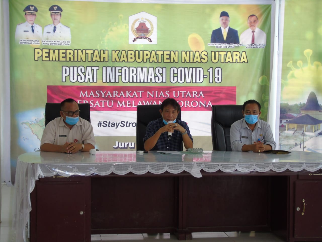 Ketua Satgas Covid-19 Nias Utara, Marselinus Ingati Nazara (tengah) didamping Jubir Yaadil Telaumbanua dan Kadinkes Yoniari Nazara Saat menggelar konferensi pers. Jum’at, (14/8/2020)/foto : ega BICARAINDONESIA-Nias Utara : Kasus Positif Covid-19 di jajaran Bawaslu Kab. Nias Utara, Sumatera Utara bertambah lima orang. Diantaranya satu komisioner dan lainnya pegawai. Masing-masing berinisial AT, MZ, MRH, IFG, dan RPT.