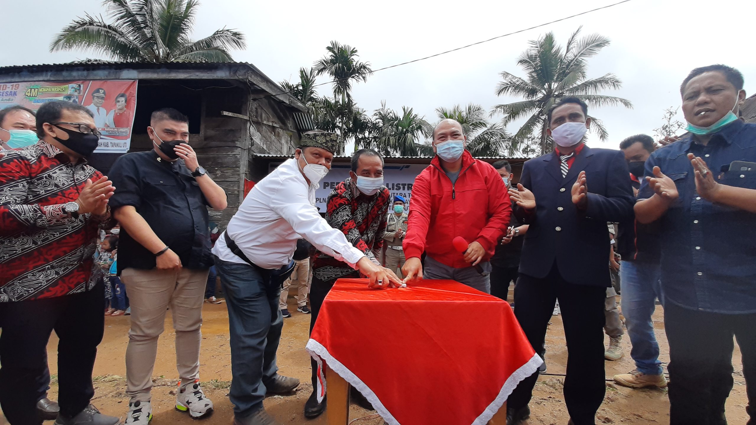 Bupati Nikson Nababan bersama GM PLN UIW Sumut M Irwansyah Putra melakukan penekanan tombol sebagai tanda penyalaan listrik 9 dusun di Taput/foto : ist BICARAINDONESIA-Taput : PT PLN (Persero) Unit Induk Wilayah Sumatera Utara (UIW Sumut) bersama Pemkab Tapanuli Utara, melakukan peresmian masuknya energi listrik untuk 9 dusun secara serentak di kabupaten tersebut, Jum’at siang (22/1/2021).