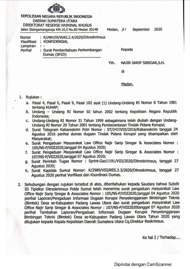“SP2D dari Ditreskrimsus Polda Sumut Nomor: K/20710/IX/Was.2.4/2020/Ditreskrimsus tanggal 21 September 2020, juga sudah kita terima sebagai pelapor atas dugaan korupsi anggaran Bimtek Dana Desa Pemkab Paluta,” ujar Najir Sarif Siregar SH dari Law Office Najir Sarif Siregar & Associates di Medan, Selasa 6 Oktober 2020.
