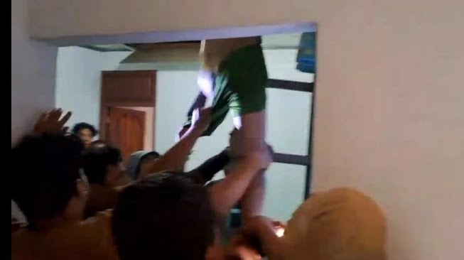 Di dalam dan luar rumah tersebut, telah banyak warga yang geram ingin memukul Indra. Ketika diturunkan melalui tangga, warga menarik celana pendeknya hingga hampir terlepas.