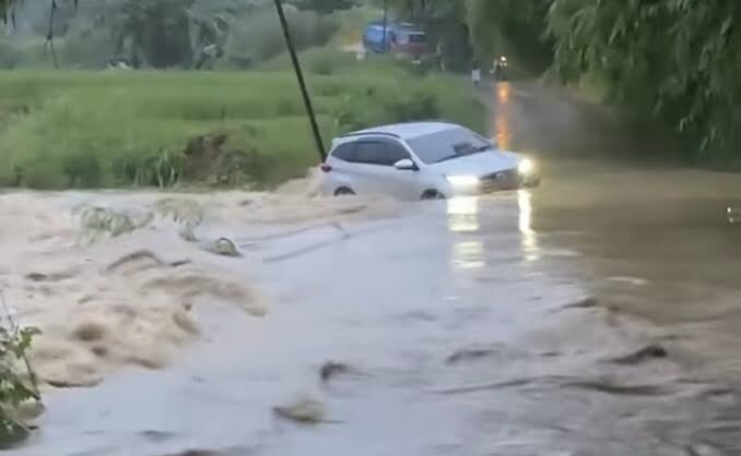 Dari video yang dilihat tim redaksi, Senin (11/8/2025), mobil itu tengah terperosok ke dalam selokan. Saat itu, kondisinya banjir hingga tingginya hampir menutupi seluruh badan mobil.