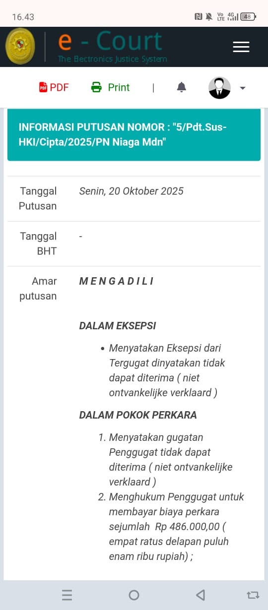 Berdasarkan amar putusan atas perkara No “5/Pdt.Sus-HKI/Cipta/2025/PLN Niaga Mdn” yang dirilis melalui sistem e-court pada Senin malam, 20 Oktober 2025 dijelaskan di poin mengadili bahwa menyatakan bahwa eksepsi dari tergugat tidak dapat diterima atau NO (niet ontvankelijke verklaard).