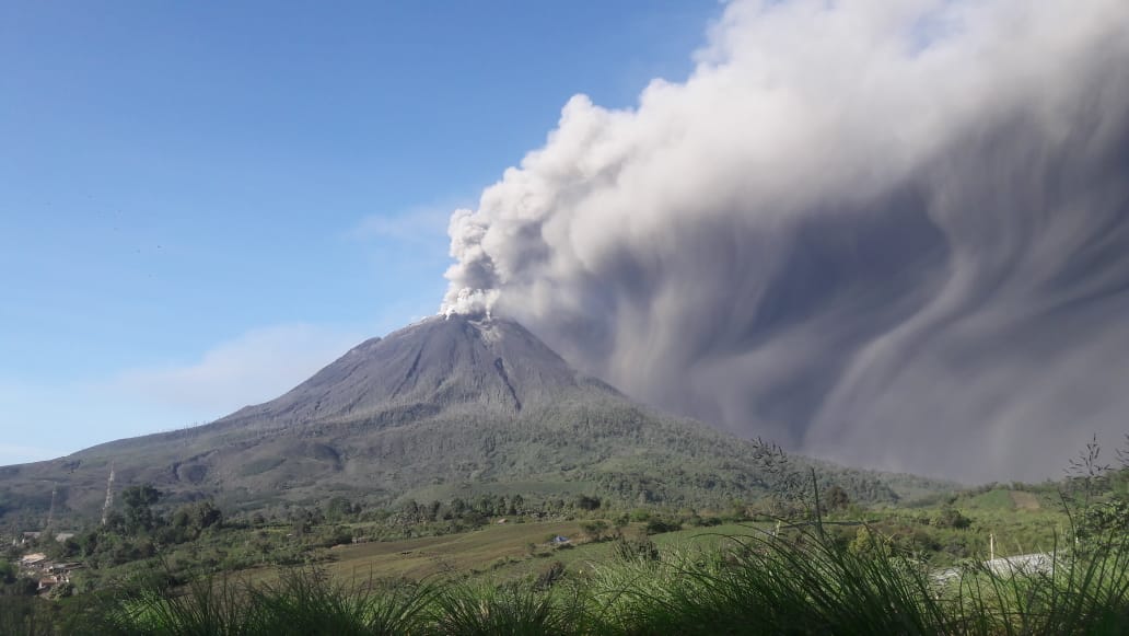 Letusan gunung api Sinabung di Karo pada Minggu pagi/foto : pos BICARAINDONESIA-Karo : Aktivitas Gunung Api Sinabung di Kab. Karo, Sumatera Utara belum juga mereka. Bahkan pada Minggu (23/8/2020), gunung setinggi 2460 mdpl itu kembali meletus.