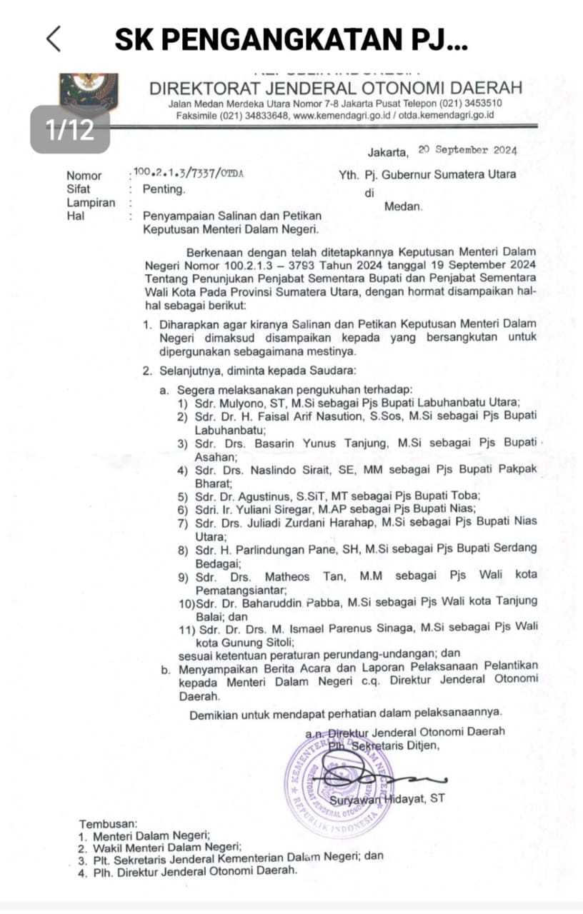 SK pengangkatan Pj kepada daerah di Sumut yang dikeluarkan Kemendagri. Tidak ada tercantum nama Aulia Rahman sebagai Pj Walikota Medan didalamnya/foto : ist BICARAINDONESIA-Medan: Isu tak sedap menerpa Aulia Rahman yang kini didapuk menduduki posisi Penjabat (Pj) Walikota Medan menggantikan Bobby Nasution yang maju sebagai Calon Gubernur Sumut.