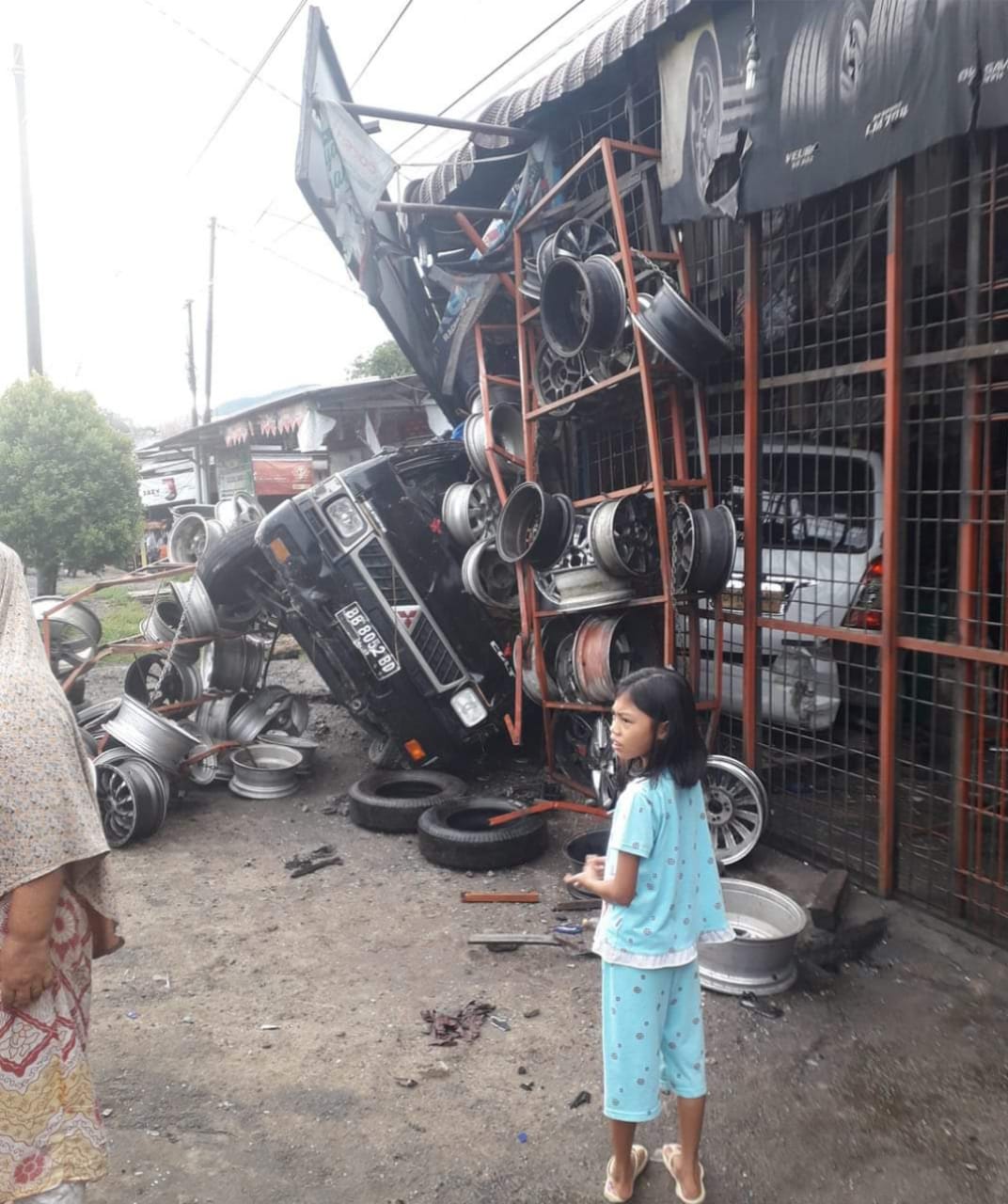 Kondisi mobil bak terbuka yang terguling setelah menghantam bengkel jaya Ban di Sibuluan Indah Km. 7,5/foto : ben BICARAINDONESIA-Tapanuli Tengah : Sebuah mobil bak terbuka (pick up) jenis Mitsubishi L300 bernomor polisi BB 8052 BD, hilang kendali hingga akhirnya menabrak Bengkel Jaya Ban di Jl. Padangsidimpuan Km. 7,5, Kec. Pandan, Kab. Tapanuli Tengah (Tapteng), Sumatera Utara, pada Rabu (3/6/2020) subuh sekitar pukul 04.45 WIB.