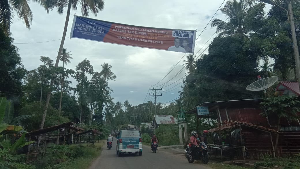 Diantara spanduk salah satu Bakal Calon (Balon) Walikota dan Wakil Walikota Gunungsitoli yang mendadak bertebaran di pusat kota hingga ke pelosok/foto : zeg BICARAINDONESIA-Gunungsitoli : Sejak kemarin, warganet dihebohkan dengan munculnya spanduk salah satu Bakal Calon (Balon) Walikota dan Wakil Walikota Gunungsitoli yang bertebaran di pusat kota hingga ke pelosok.