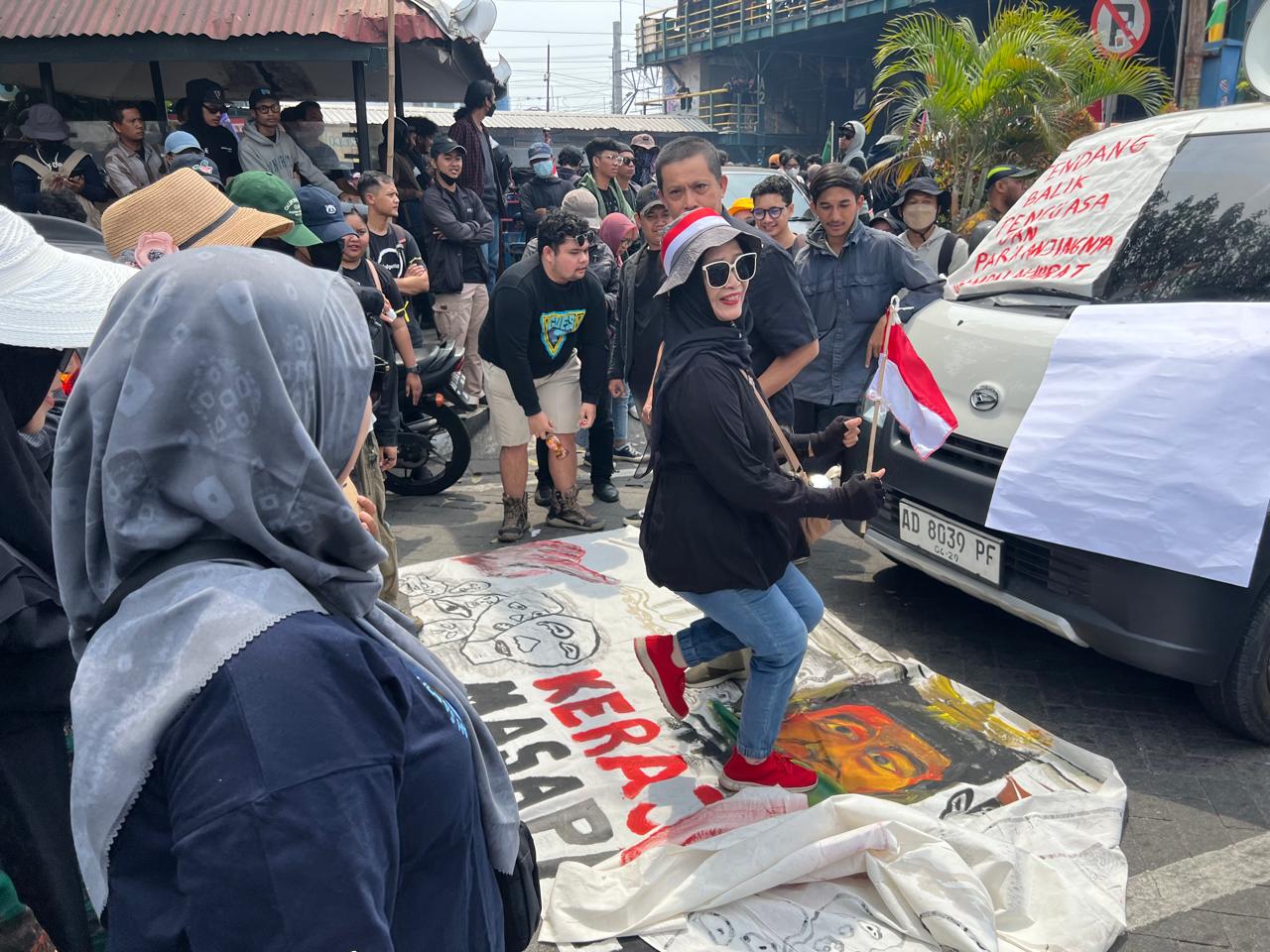 Dalam aksi damai yang diawali konvoi dari parkiran Abu Bakar Ali ke Gedung DPRD Yogyakarta di kawasan Malioboro, massa juga tampak sengaja memajang lukisan berwajah mirip Jokowi yang mereka letakkan di jalan. Satu persatu demonstran yang gerak lantas menginjaknya secara bergantian.