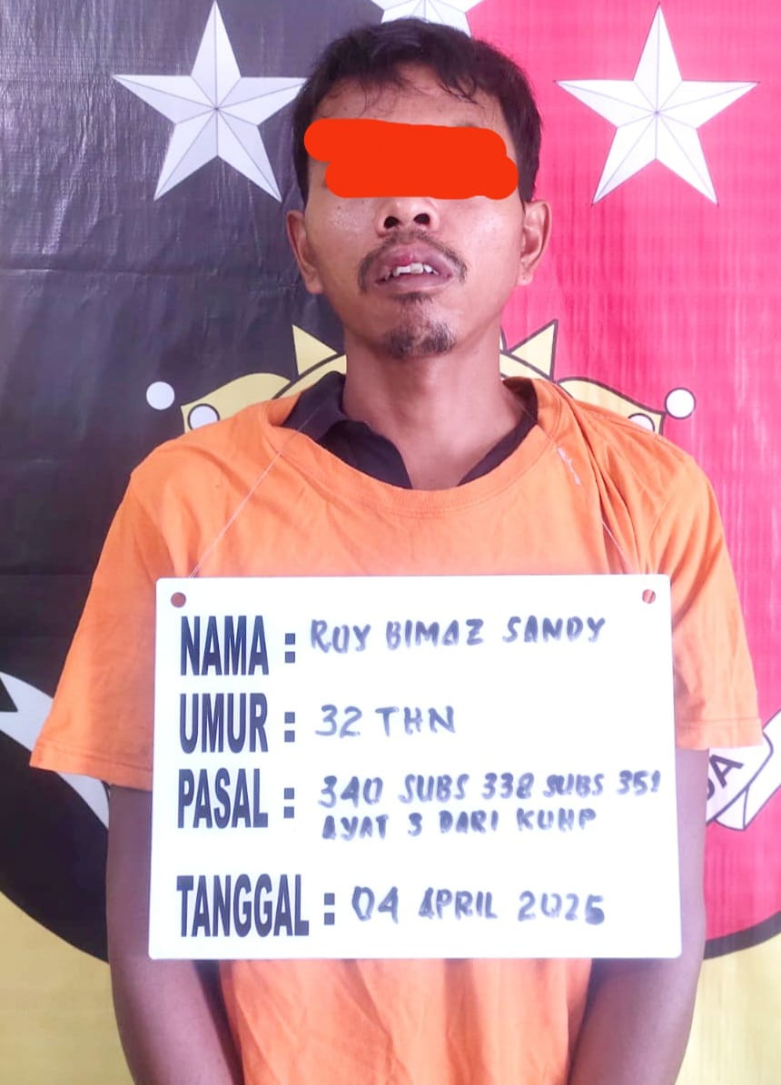 Pelaku RBS alias Bima usai diamankan pihak kepolisian/foto: ist BICARAINDONESIA-Labuhanbatu: Seorang satpam PT Hijau Priyan Perdana (HPP), tewas setelah dibacok dengan menggunakan egrek sawit. melakukan pembacokan dengan Egrek sawit terhadap Security PT. HPP. Pelakunya adalah RBS alias Bima, rekan kerja korban di perusahaan tersebut.
