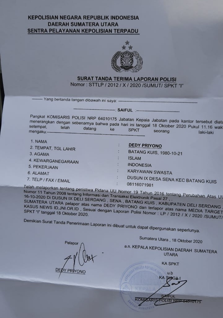Dalam laporan warga Dusun IX, Desa Sena, Kec. Batangkuis, Kab. Deliserdang tersebut, kedua media online tersebut terindikasi telah melakukan tindak pidana seperti yang diatur dalam Undang-Undang Nomor 19 Tahun 2016 tentang Perubahan Atas Undang-Undang Nomor 11 Tahun 2008 tentang Informasi dan Transaksi Elektronik Pasal 27, setelah menyiarkan berita dengan judul yang sama “Dedi Priono Alias Toton Pemilik Toko Prion’s Terlibat Menjual Belikan Lahan Aset PTPN2 Bersama Sutrisno S.Pd I” yang dipublikasikan pada Jum’at, 16 Oktober 2020.
